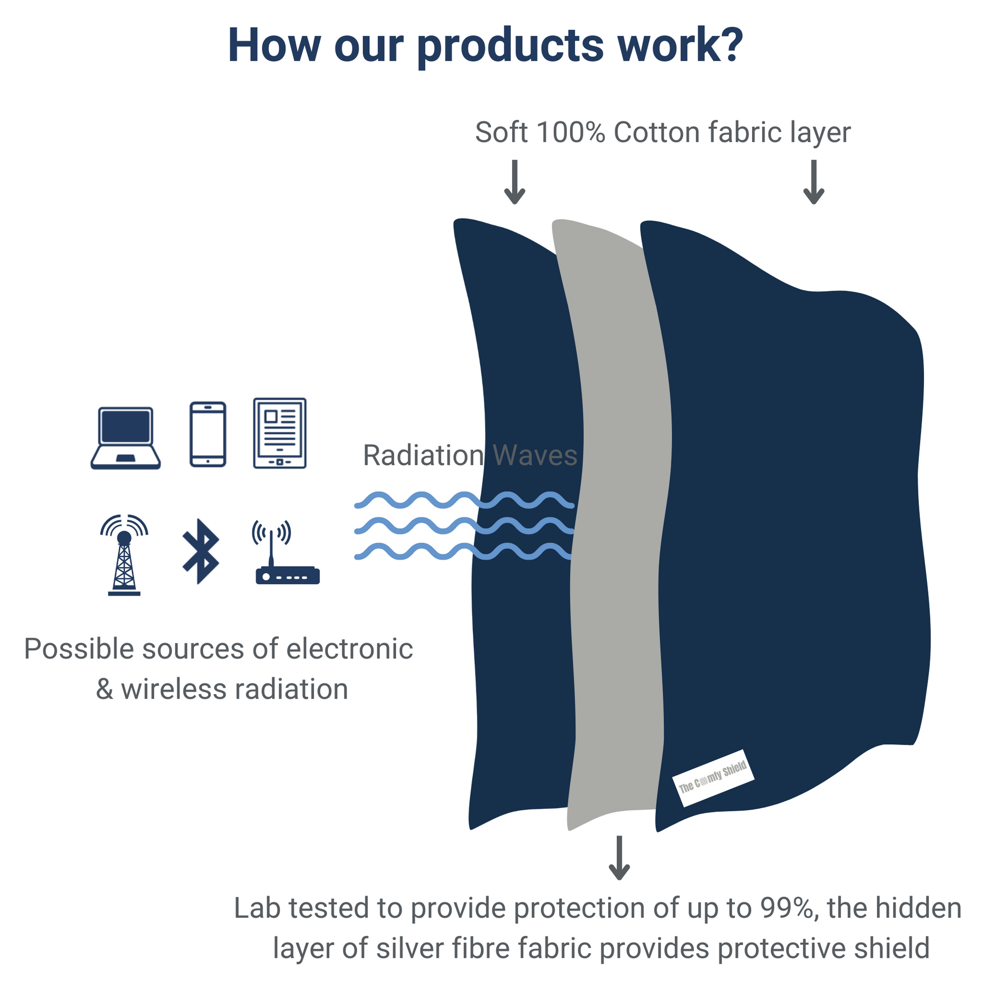 High quality 100% cotton & are designed to feel like a comfy, soft blanket. In between the cotton fabric is a layer of hidden silver fabric which provides shielding against electronic radiation