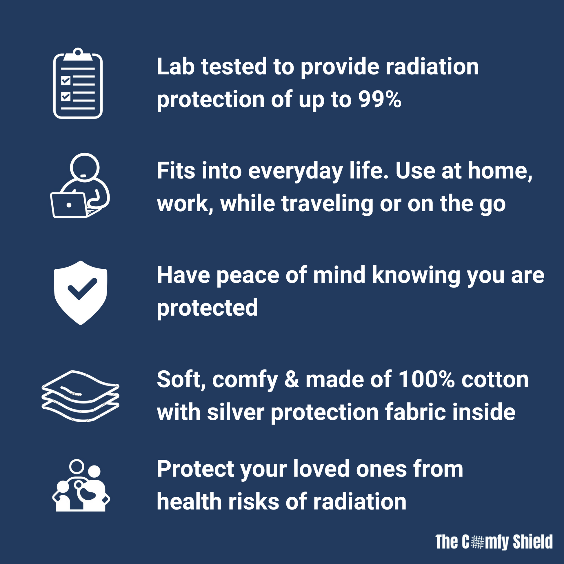WHY THE COMFY SHIELD? Have peace of mind knowing your body is protected from electronic & wireless radiation when using a Tech Device, it’s a simple way to keep you comfy & safe!