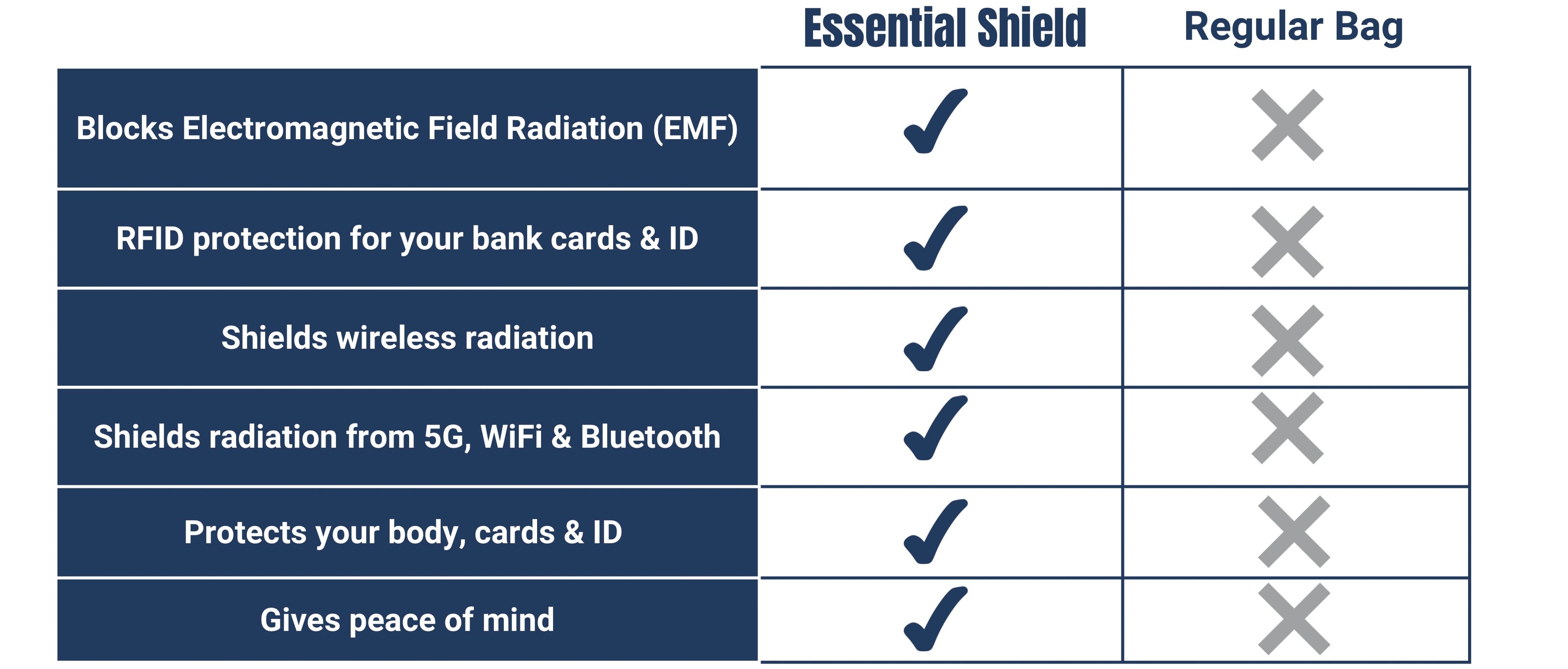 WHY USE THE ESSENTIAL SHIELD? The bag has a special phone pocket designed to shield against electronic & wireless radiation from your Mobile Phone & radiation from wireless signals like 5G, WiFi & Bluetooth. The bag is also lined with RFID shielding technology to protect your Credit Cards, ID & Passport. Great to use everyday, while exercising or traveling